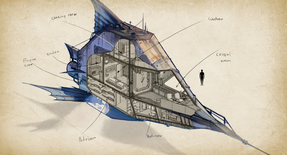 Another deeper look into the concept of the Nautilus submarine, this time inside. I imagined the vehicle requires three people to operate at the same time.